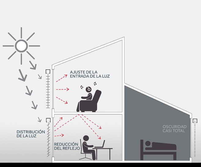 • Permite regular con precisión la entrada de luz en cada estancia, adaptándose a las necesidades de confort y luminosidad. • Las lamas pueden orientarse hasta alcanzar el ángulo deseado, dirigiendo la luz natural hacia el techo y distribuyéndola de forma suave y uniforme. • Minimiza los reflejos en pantallas y dispositivos, reduciendo la fatiga ocular y mejorando el bienestar visual.
